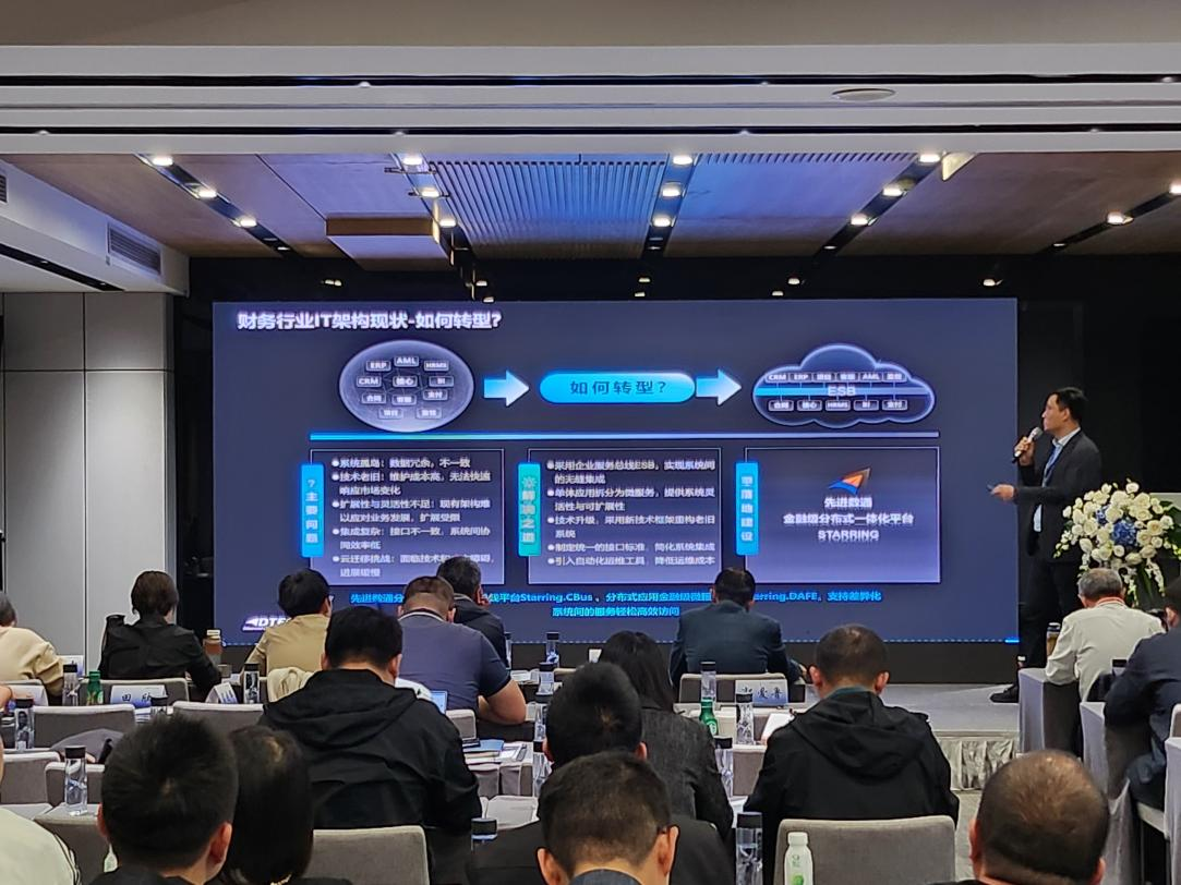 黄金城集团代表讲师郭钰以《昆仑与黄金城集团ESB解决方案助力财务行业创新与架构转型》为主题作发言分享。他深入剖析了当前财务行业IT架构面临的挑战,包括系统孤岛、技术老旧、扩展性不足等问题,并提出了基于企业服务总线(ESB)和微服务架构的转型方案。